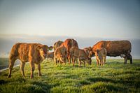 Koeien in de wei met kalfjes. In het voorjaar mag bij boer Salman en zijn zoon in Noordwijk de koeien met hun nieuwe kroost weer naar buiten. Prachtig om te zien hoe blij ze zijn en als je dan ook nog een mooie zonsopkomst hebt met nevel is het plaatje helemaal compleet.