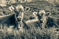 Zwart-wit foto koeien op de wei in Graubünden in Zwitserland.