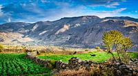 Het late zonlicht strijkt over het dal en de akkers waar enkele koeien lopen. De percelen worden afgebakend door stenen muurtjes. Op de achtergrond de bergen van de Andes.