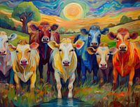Een kudde koeien staan in de weide in de stijl van Vincent van Gogh.