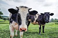 Nederlandse Zwartbont koeien in het weiland. Genieten van het verse gras. Vrede op aarde. Een Fries-Hollands rund. Typisch gezicht in Nederland.
