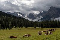 Een aantal koeien ligt rustig in het weiland met in de achtergrond de enorme bergtoppen van de Zwitserse Alpen.