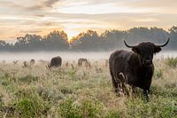 Schotse hooglanders in natuurgebied in de grote peel grazen bij zonsopkomst in de dauw. De voorste kijkt nieuwsgierig toe.