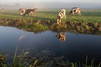 Koeien in de mist waarvan één afwijkt van de kudde.