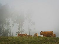 Het mistige landschap van Spanje rond Santillana del Mar met z'n koeien en eucalyptus bomen.
