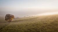 Koeien grazend op een weide in het Limburgse Heuvelland tijdens een mistige zonsopkomst tussen Gulpen en Wijlre.