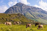 Koeienkudde op de alpenweide in Graubünden in Zwitserland.