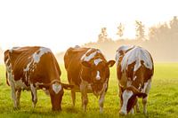 Koeien in een weide tijdens een mistige zonsopgang in de IJsseldelta. Het Rode Holsteinse Friese melkvee graast in het groene gras.