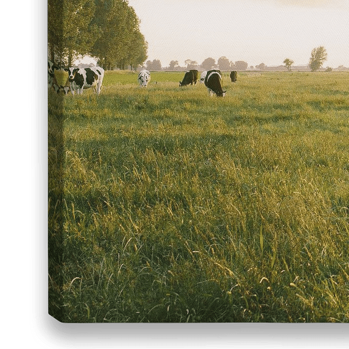 Koop dit koeien kunstwerk Koeien in de wei tijdens zonsondergang van Wilko Visscher op canvas, aluminium dibond, (ingelijste) fotoprint, behang en ArtFrame, op maat geprint in Fine-Art kwaliteit.