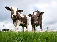 Deze puur Hollandse koeien staan in het weidelandschap in Midden Beemster Noordholland. Door de oerhollandse wolken luchten krijgt deze foto een bijna schilderachtig en historische sfeer. Koeien blijven facineren en zijn uitermate geschikt om te portretteren. De eigenwijze blik is altijd treffend.