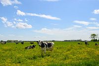 Koeien in een weide met frisgroen gras en boterbloemen in het voorjaar in de IJsseldelta bij Kampen in Overijssel, Nederland.