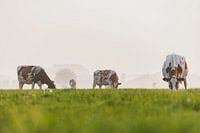 Koeien in een weiland tijdens een mistige zonsopgang in de IJsseldelta. Het rode Holstein Fries melkvee graast in het groene gras.