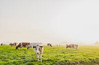 Koeien in een weiland tijdens een mistige zonsopgang in de IJsseldelta. Het rode Holstein Fries melkvee graast in het groene gras.
