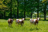 Drie koeien staan in het groene gras in een weiland in Overijssel tijdens een mooie zomerdag. Het veld is omgeven door bomen.