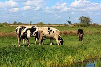 Een kudde koeien is bezig met grazen in een weiland tussen Bodegraven en Reeuwijk, midden in het Groene Hart van Nederland. De Oukoopse Molen is nog zichtbaar in de achtergrond.