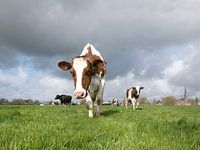 Deze puur Hollandse koeien staan in het weidelandschap in Midden Beemster Noordholland. Door de oerhollandse wolken luchten krijgt deze foto een bijna schilderachtig en historische sfeer. Koeien blijven facineren en zijn uitermate geschikt om te portretteren. De eigenwijze blik is altijd treffend.