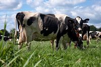 Nieuwsgierige koe in weiland met prachtige lucht.