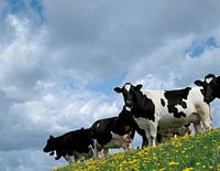 koeien, zwartbont, vee, dijk, wolken, lucht, voorjaar, bloemen