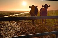 Nieuwsgierige koeien op een mistige ochtend met op de voorgrond een spinnenweb met ochtenddauw.