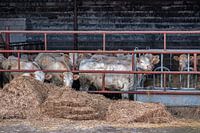 Een aantal witte koeien in een kleine stal in Zuid-Frankrijk. De koeien staan achter een hoog metalen hek. Voor het hek liggen een paar strobalen. De koeien zijn niet stralend wit maar een beetje viezig en modderig. Ze eten van het stro.