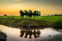 Nieuwsgierige koeien gespiegeld in de sloot.
