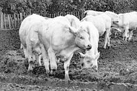 Een stel koeien in de kleur wit.Een mooi contrast met de zwarte zeeuwse klei waar ze op rondlopen.