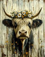 De majestueuze hoofdtooi van verse madeliefjes en fijne gele bloemen omlijst het voorhoofd van de koe als een kroon en geeft haar een bijna koninklijke uitstraling. De tere blaadjes en kleine knoppen tussen de bloemen benadrukken de romantische uitstraling. De gebogen hoorns die zachtjes uit de kop groeien, geven het portret een krachtige maar zachte balans.