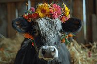 Ervaar de charme van het plattelandsleven met dit warmgetinte portret van een koe, liefdevol versierd met een krans van heldere zonnebloemen. Dit kunstwerk vangt de zachte uitstraling en aardse schoonheid van het boerenleven en voegt een vleugje rustieke gezelligheid toe aan elke kamer. Ideaal voor liefhebbers van de landhuisstijl of als blikvanger in een moderne stedelijke sfeer. De goudgele kleuraccenten en de kalmerende blik van het dier maken dit schilderij tot een uitnodigende aanvulling op elke wanddecoratie en een hartverwarmend cadeau voor dierenliefhebbers.