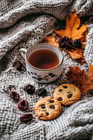 Er ontvouwt zich een gezellig samenspel van herfstkleuren en aroma's: een dampende mok thee slingert zich naast knapperige koekjes bezaaid met chocoladeschilfers. Het warme, grijze gebreide patroon van de deken nodigt uit om te ontspannen, terwijl gouden bladeren en donker gedroogd fruit het tafereel harmonieus completeren. Een…
