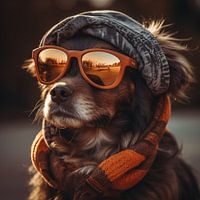 Een schattige hond met een zonnebril en een sjaal, met een herfstlandschap weerspiegeld in zijn bril. De achtergrond is wazig om zijn gezicht te benadrukken. Hij heeft een bruine vacht en draagt een gebreide muts. Het is tijd voor zonsondergang en het warme oranje licht weerkaatst op hem. Deze foto is buiten genomen tijdens het gouden…