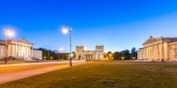 Königsplatz met de Staatliche Antikensammlungen, Propyläen en de Glyptothek in München bij nacht.
