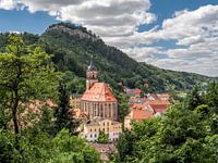 Je zou het niet voor mogelijk houden op dit kleine, onopvallende pad, maar de lange trap naar de Heideberg biedt trede na trede een steeds mooier uitzicht over de stad Königstein en de majestueuze vestingberg op de achtergrond. Prachtig ingebed in het dal van de Elbe, domineert de stadskerk het stadsbeeld aan de voet van de gelijknamige vesting.
