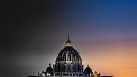De koepel van de Sint Pietersbasiliek in Rome bij zonsondergang. De combinatie tussen zwart-wit en kleur benadrukt de historie van het gebouw en maakt de overgang naar het heden.