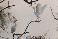 Koereigers (Ardea ibis) vechten om het beste plekje op de slaapplaats in de moerassen van de Carmargue in Zuid-Frankrijk.