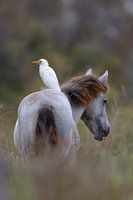 Camargue-paard met een koereiger op zijn rug in het moeraslandschap van de Camargue in Zuid-Frankrijk.