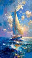 De lucht boven is een dynamisch spel van kleuren, met brede penseelstreken die van lichtblauw naar wit en goud overlopen, wat de suggestie wekt van een vroege ochtendzon die door de wolken breekt. Het zeil van het schip…