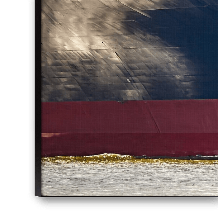 Een imposante boeg snijdt door het water - symbool voor beweging, handel en wereldwijde verbindingen. De kleuren van de romp, het embleem en de containers vertellen over reislust en functie.