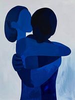 Dit rustgevende, intieme kunstwerk toont een tedere omhelzing tussen twee figuren, geschilderd in krachtige blauwtinten tegen een zachte witte achtergrond.