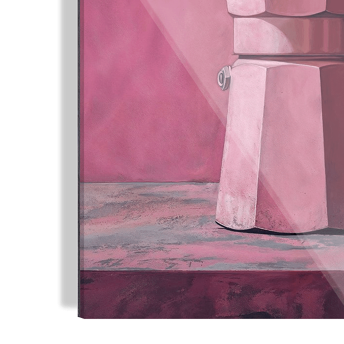 Schilderij van een roze Percolator (koffiepot). Een rustig stilleven in 1 kleur. Prachtig om je keuken op te vrolijken. Ook heel leuk om een aantal werken uit deze serie met elkaar te combineren. Kan in dezelfde of ook met verschillende maten en materialen.