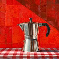 Schilderij van een zilverkleurige Italiaanse percolator op een rood geruit tafelkleed en tegen een rode muur. Er valt ook een diagonale schaduw op de muur. Heel leuk werk uit de serie "Koffie - Percolators". Ook goed te combineren met een ander werk uit deze serie. Fantastisch voor in de keuken, maar misstaat ook niet in de woonkamer of bij een lunchroom of restaurant.
