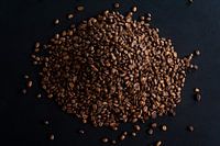 Een berg koffiebonen op een zwarte ondergrond. Het bruine goud spreid zich over de zwarte achtergrond.