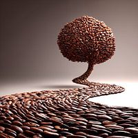 Een pad gelegd met koffiebonen leidt naar een boom die eveneens gevormd is uit koffiebonen.