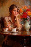 Een zweem van herinneringen zweeft door de kamer terwijl de jonge vrouw met een dromerige blik het boeket bloemen bewondert. Haar peinzende houding en het zachte licht dat rond de kopjes speelt, creëren een harmonieuze sfeer die de stilte van een ontspannen middag vol gedachten en gevoelens vastlegt.