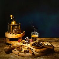 Stilleven met antieke koffiemolen ,dampende koffie ,kaneelanijs, koffiebonen en rode pepers op mooie houten olijfhouten planken .