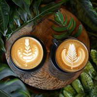 Dit kunstwerk vangt de essentie van een ontspannen koffiemoment met twee kunstzinnig vormgegeven lattes in zwarte kopjes omringd door weelderig groen. De combinatie van de gedetailleerde bladeren en de smaakvolle latte-kunst brengt een sfeer van rust en genot over. Deze afbeelding is ideaal voor cafés, keukens of woonkamers en brengt een stukje natuur en de geur van verse koffie in je kamer.