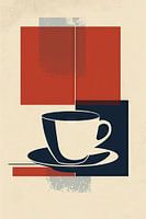 Dit abstracte kunstwerk combineert geometrische vormen met een minimalistische voorstelling van een koffiekopje. De gedurfde, contrasterende kleuren rood, blauw en beige geven de afbeelding een moderne esthetiek. Dit kunstwerk is ideaal voor het decoreren van keukens en cafés en biedt een harmonieuze balans tussen kunst en design, perfect voor liefhebbers van hedendaagse en decoratieve kunst.