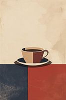 Dit abstracte kunstwerk combineert geometrische vormen met een minimalistische voorstelling van een koffiekopje. De gedurfde, contrasterende kleuren rood, blauw en beige geven de afbeelding een moderne esthetiek. Dit kunstwerk is ideaal voor het decoreren van keukens en cafés en biedt een harmonieuze balans tussen kunst en design, perfect voor liefhebbers van hedendaagse en decoratieve kunst.