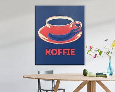 Een gestileerde afbeelding toont een koffiekop met schotel in krachtige kleuren - rood, beige en licht- en donkerblauw - tegen een donkerblauwe achtergrond. Het Nederlandse woord voor koffie, "KOFFIE", is te lezen onder het kopje in bijpassende kleuren.