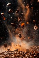 Een dynamische explosie van koffiebonen, gevangen zwevend in een spel van licht en schaduw, roept een gevoel van energie en levendigheid op. De warme bruine tinten en de fijne stofwolk geven de kamer een uitnodigende sfeer. Deze foto is perfect voor de keuken en zorgt voor een energieke start van de dag.