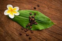 Stilleven van geroosterde koffiebonen liggend op een groen blad en een houten balk met mooie diepe nerven. Mooie plumeria / frangipani als decoratie. Mooi voor in een koffiehuis.